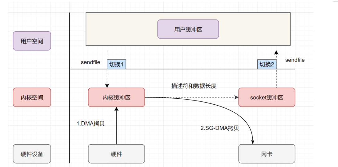 sendfile系统调用,上下文(切换 1)从用户态转向内核态DMA控制器,把数据从硬盘中拷贝到内核缓冲区。CPU将读缓冲区中数据拷贝到 socket 缓冲区DMA控制器,异步把数据从 socket 缓冲区拷贝到网卡,上下文(切换2)从内核态切换回用户态,